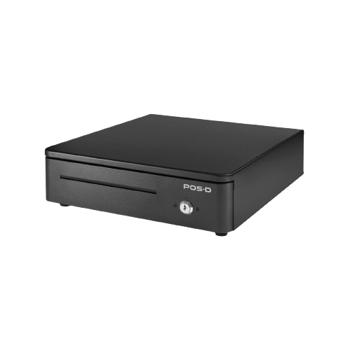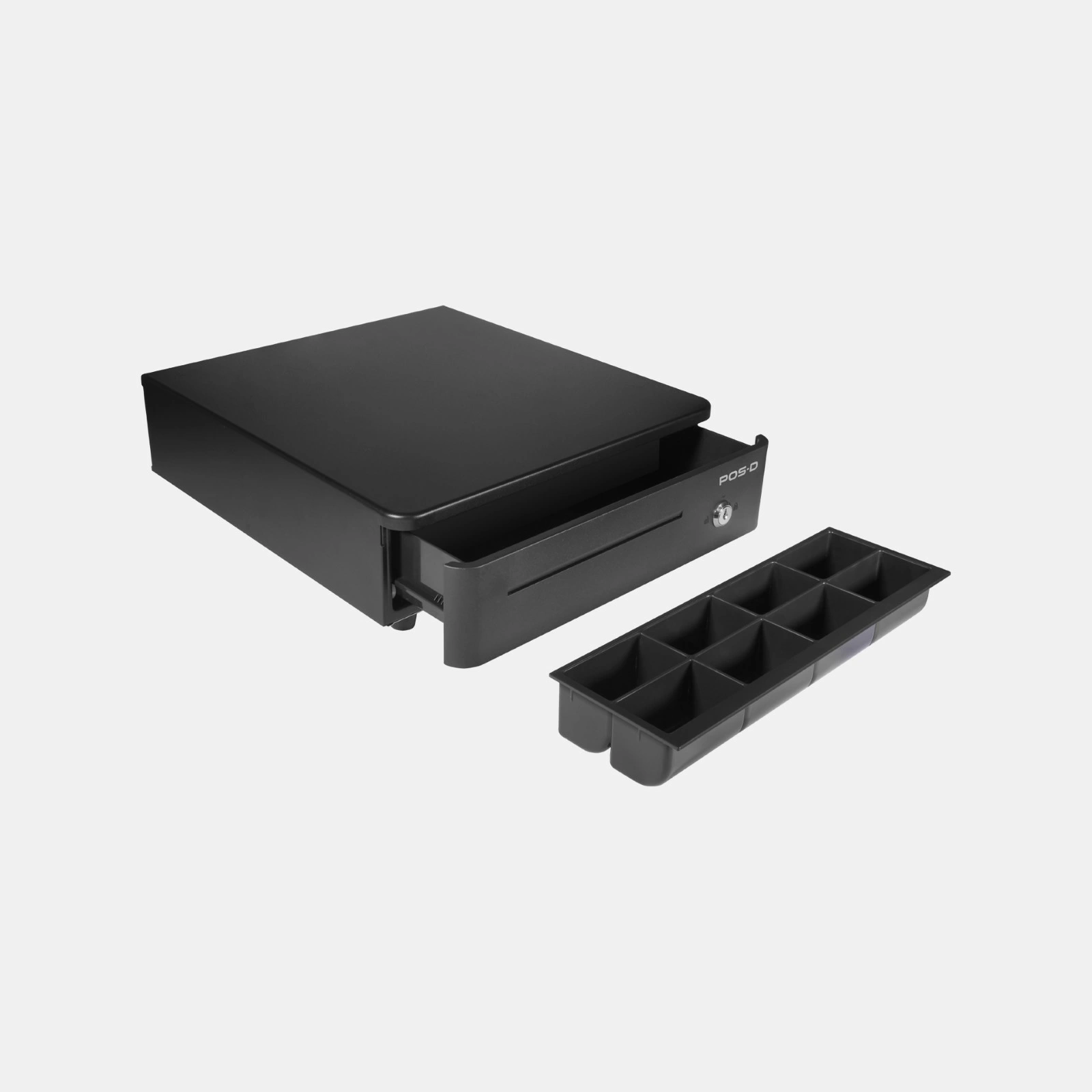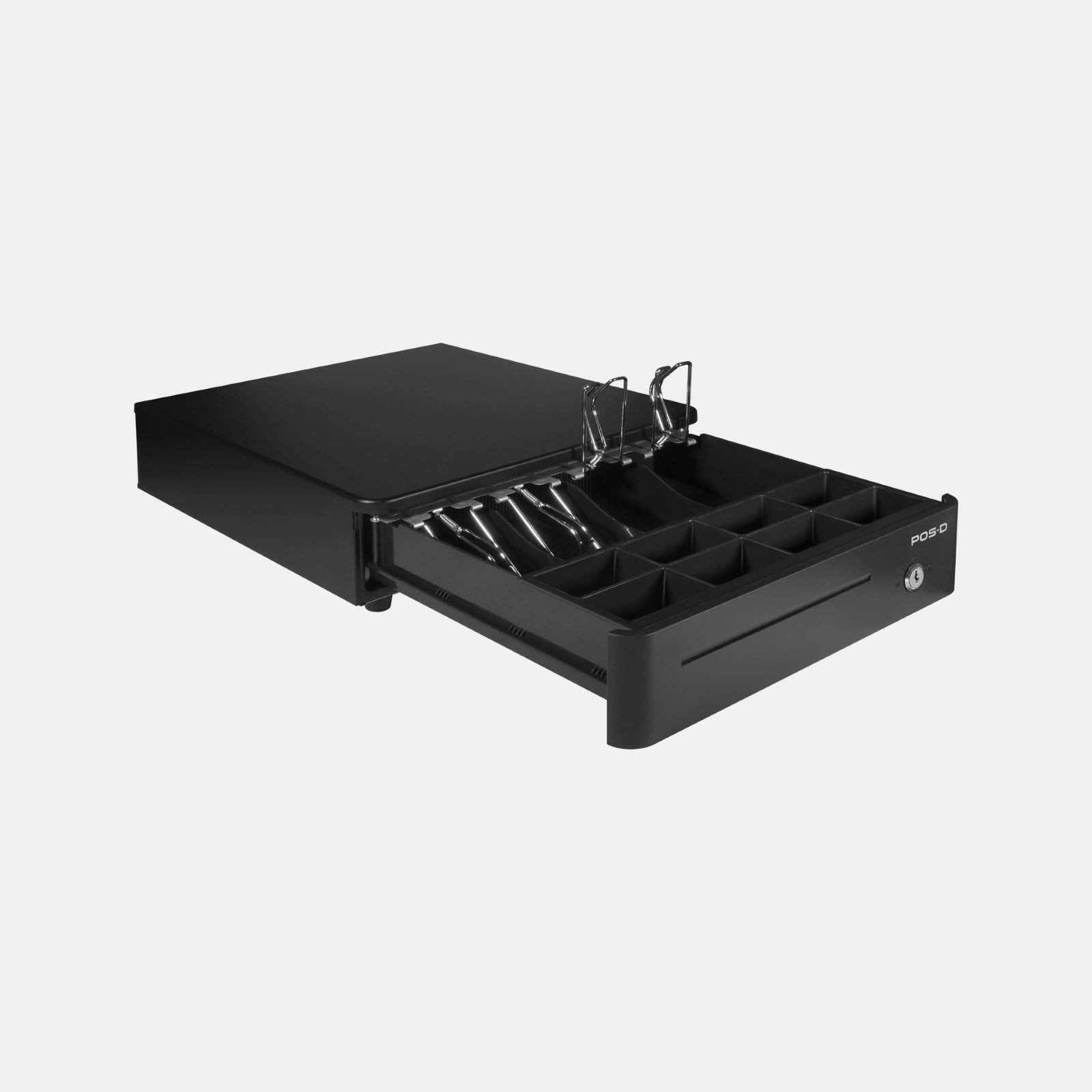 Cajón de dinero de metal pintado al horno funcional y resistente con 4 divisiones para billetes y 8 para monedas de 33 cm de ancho ideal para aquellos puntos de venta con espacio reducido.
